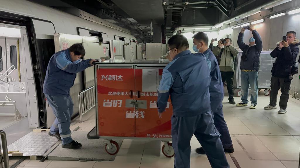 快递进入行李车厢“乘上”北京大兴机场线。(邓秋铃 摄)