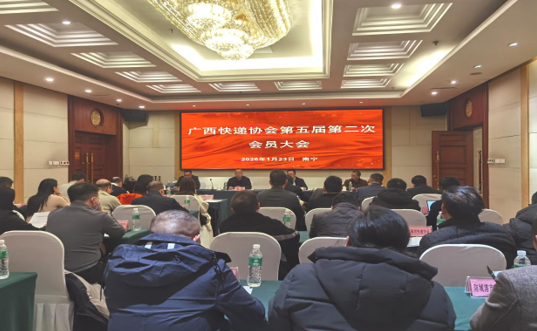 1月23日,广西快递协会第五届第二次会员大会在南宁召开。会议总结2025年区快递协会工作,安排部署2026年重点工作,听取审议相关报告。区邮政管理局市场监管处处长许承伟出席会议并讲话,区快递协会成利会长作工作报告,副会长潘国庆作财务情况报告。