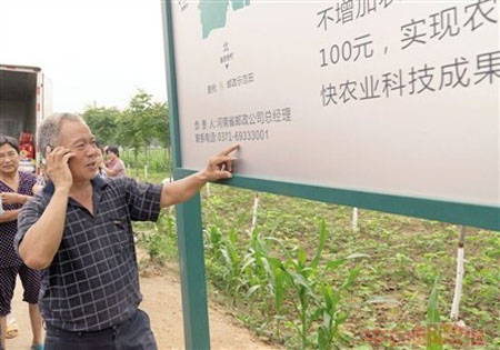 在河南邮政万亩示范田地头竖立的每块牌子上,都有河南省公司领导的电话号码,便于农民有问题及时联系、解决。图为7月28日,新郑市龙王乡铁李村村民李战民在邮政示范田地头打电话向河南省公司领导汇报庄稼生长情况。刘鸿波摄